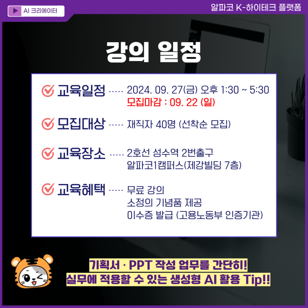 교육일정 | 2024. 09. 27(금) 13:30-17:30 (4시간) |